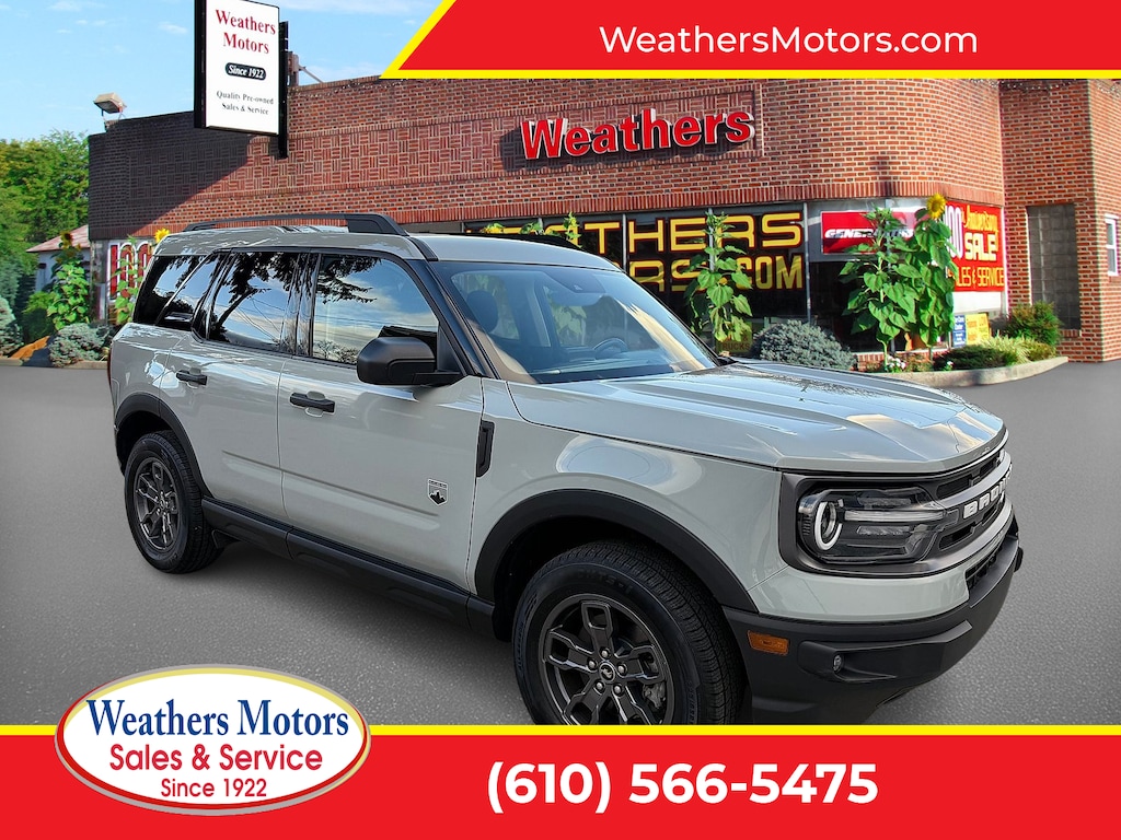 "25/28 City/Highway MPG 2023 Ford Bronco Sport Big Bend in Cactus Gray Sought After Options Include ****Apple Car Play/Android Auto Auto High-beam Headlights Cargo Management System Convenience Package Front Driver & Passenger Seatback Zipper Pockets Heated Front Bucket Seats Intelligent Access (Lock/Unlock) Leather-Wrapped Steering Wheel LED Fog Lamps Rear Parking Sensors Speed-sensing steering Speed-Sensitive Wipers SYNC 3 Communications & Entertainment System Universal Garage Door Opener (UGDO) Wireless Charging Pad **Electronic Stability Control **Exterior Rear Back Up Camera **Security System **Steering Wheel Controls **WE BUY CARS & TRUCKS **We Offer Low Financing Rates **Weathers Motors- Recipient of ""Federated DEALER of the YEAR AWARD"". Recent Arrival! CARFAX One-Owner.WEATHERS MOTORS- CELEBRATING OVER 103 YEARS IN BUSINESS- Sales & Service....Media West Chester Chester Concordville Glen Mills Aston Brookhaven Springfield and Ridley used cars near me auto repair near me.........SAVE BIG $$ We price our cars below market value right from the start. You get a great car at an exceptional price! .**Call our friendly sales staff at 610-566-5475 to schedule your appointment. Enjoy our relaxed no pressure policy. Award winning dealer- Family owned and operated Since 1922. Free CARFAX Report with every vehicle. All of our vehicles are Serviced State Inspected then Professionally Detailed. That's the Weathers Way. WE SELL SERVICE ( Oil Change PA State Inspection Tires Brakes Auto Repair Engine Repair ) and BUY all makes and models imports and domestics. Check out our website: WeathersMotors.com."
